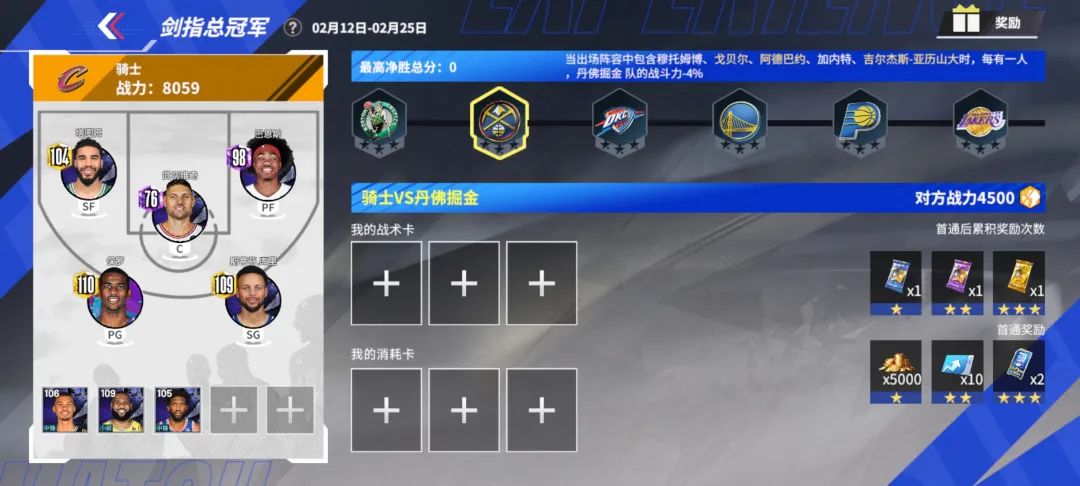 “剑指总冠军”是一个在限时开放的赛季玩法中,通过自选与随机球员结合组建专属球队,并运用战术/消耗卡牌提升战力进行模拟对战,最终根据净胜分所在区间获取奖励的策略性挑战玩法。