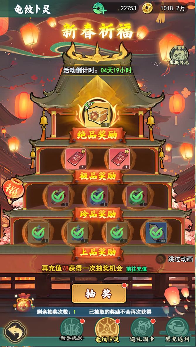 - 龟纹卜灵:参与抽奖,可获得上品、珍品、极品、绝品多重奖励