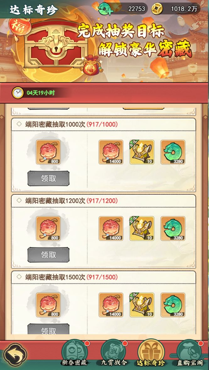 - 达标奇珍:完成抽奖目标,解锁豪华密藏