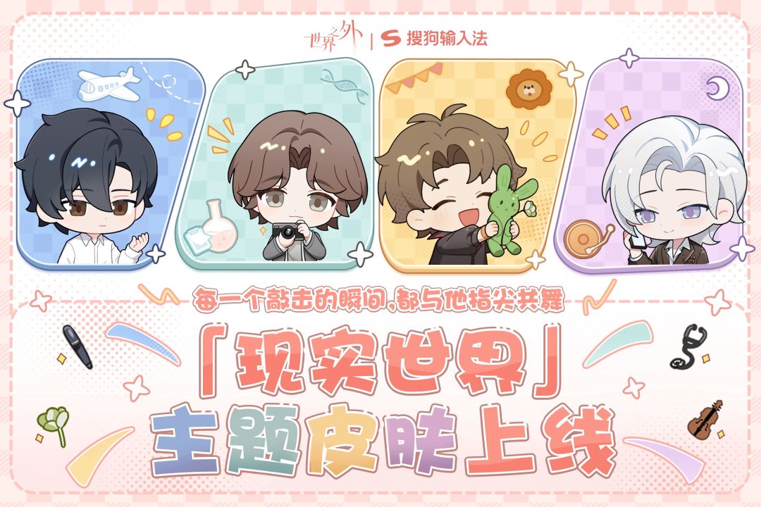 本次联动以《世界之外》四位男主为核心设计,推出专属动态键盘皮肤,包含按键动效、角色浮层动画、Q版弹跳特效等细节,搭配角色专属聊天气泡与闪光语录。玩家可在搜狗输入法装扮商城搜索“世界之外”免费领取,一键将输入界面换成游戏内心动风格,兼顾实用性与二次元氛围感。
