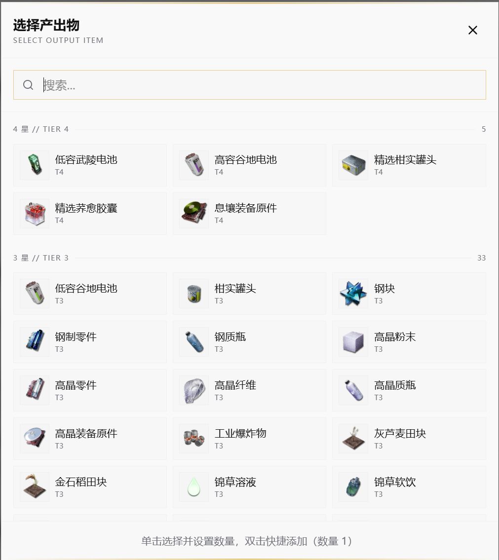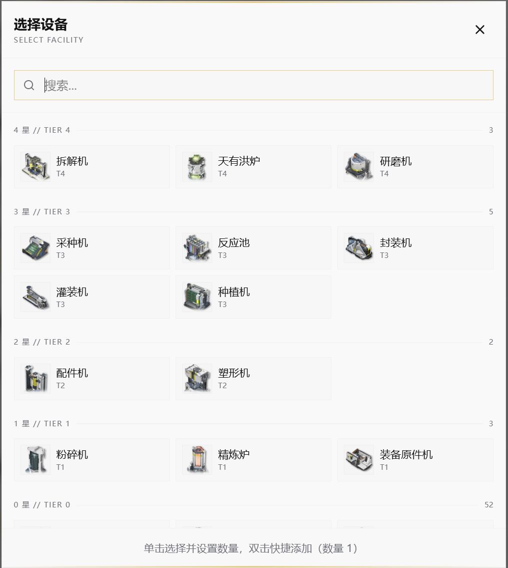 多维参数: 支持快捷选择产出物、原料、设备清单、功率需求、所属板块及基地位置,让数据一目了然。