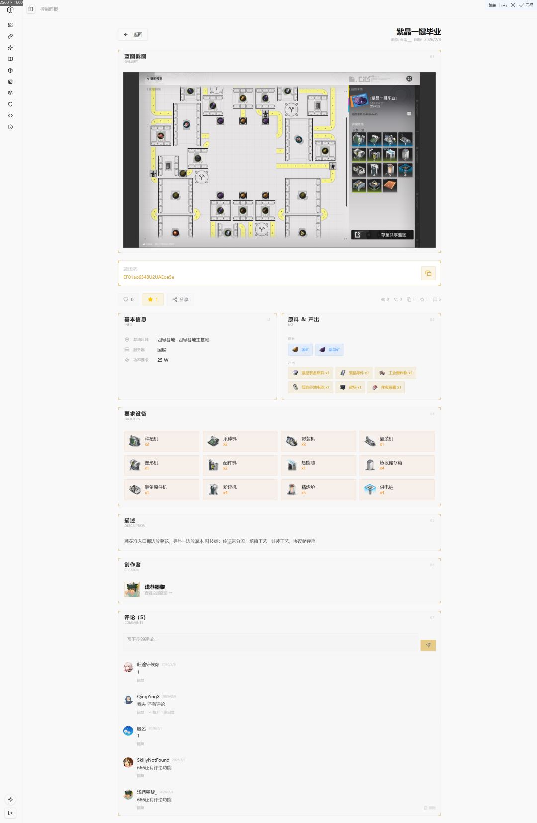 深度交互: 详情页可一键复制蓝图码,查看创作者的详细描述。玩家可以进行点赞、收藏,并在评论区交流心得。
