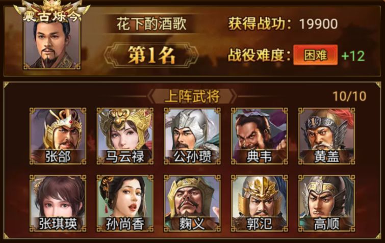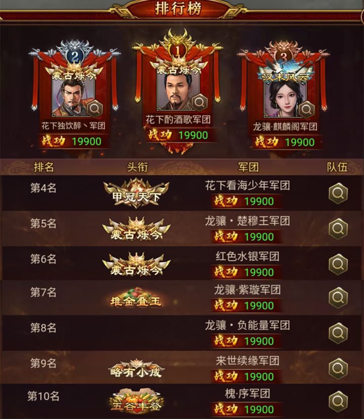 成功荣登本期小沛之战榜首的是 花下酌酒歌 军团,以 19900 的战功赢得第一的宝座!