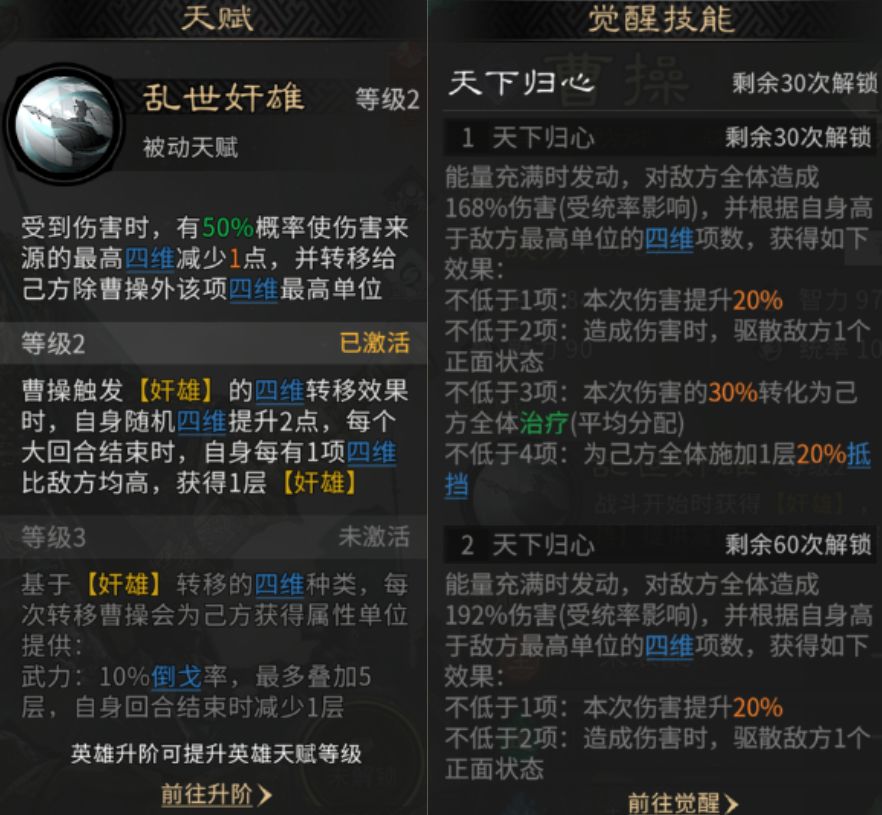 曹操的觉醒技能【天下归心】,为全体AOE,技能效果完全取决于曹操的四维是否碾压对手(对比敌方至高单位):压制1项增伤,2项驱散,3项全体治疗,4项全体格挡。所以曹操技能可以多携带除统率外其余四维的技能,可以增加对应的四维。曹操的四维越高,这个技能就越全面(集输出、驱散、回复、防御于一体)。