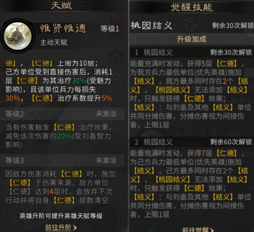 刘备的天赋【惟贤惟德】,在友受击时触发回血与高额免伤,自带“残血保护”。解锁3级天赋后质变:敌方攻击刘备队友会为敌方施加【仁德】,叠满4层【仁德】直接强制跳过回合。极度克制高频输出,让对手“越打越被控”。