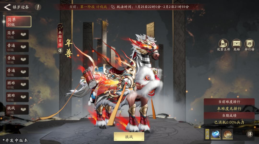 该阶段需对首领【年兽】造成伤害,累计积分,根据积分进度和排名获得奖励。