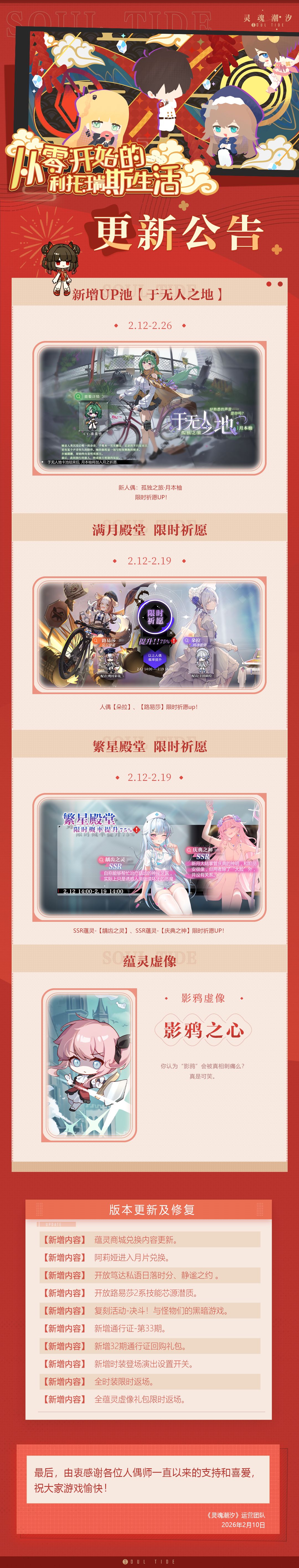 《灵魂潮汐》预计于2月12日14:00——18:00进行停机维护,维护期间将无法登录游戏,给您带来的不便敬请谅解。本次维护预计持续4小时,维护时间可能延长或提前结束,具体时间请以开服时间为准。维护结束后,维护补偿将以邮件的形式发送至您游戏内的邮箱。为避免出现物品损失、进度丢失等异常情况,还请在13:50前完成关卡结算。
