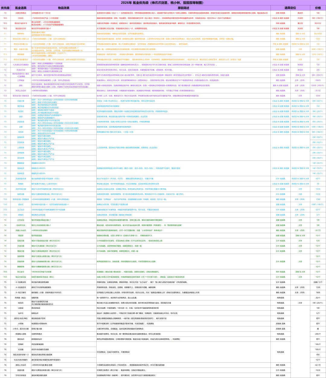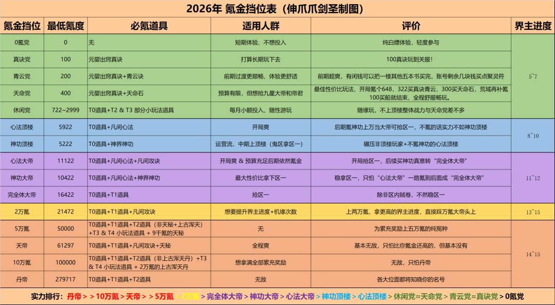 本次为大家整理了 2026年度最新氪金优先表,方便各位道友参考。新年新帖,以往的 2025年氪金优先表和 《凡人传说》3.2版本氪金优先级表 已作废,仅作为纪念保留。今年更新的氪金道具和优先策略,将会 持续更新在本帖,随时查看最新信息。