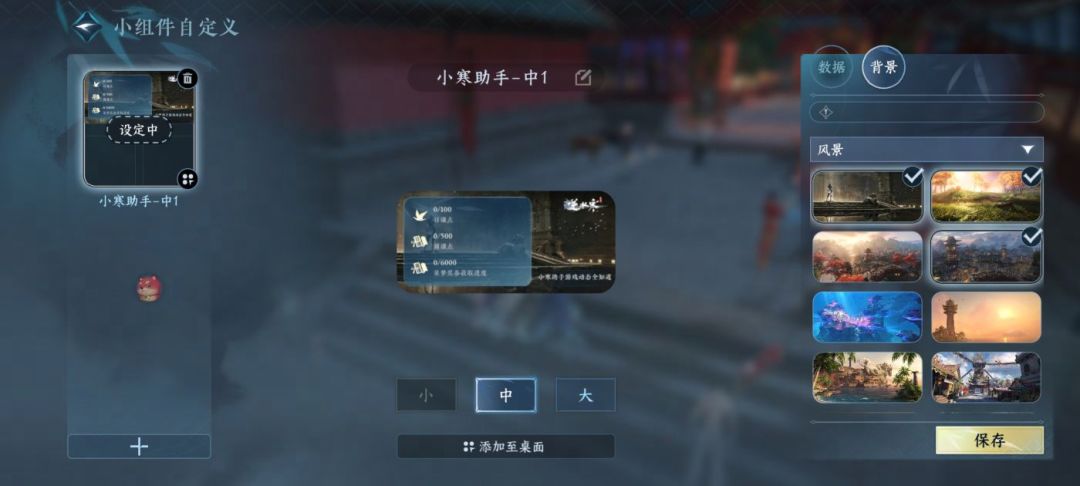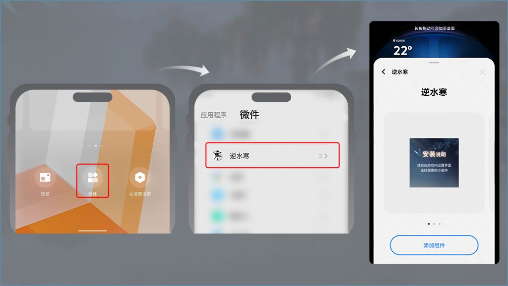 步骤三:长按桌面进入编辑状态,点击微件,在微件列表中找到逆水寒,选择对应尺寸的万能小组件添加到桌面。