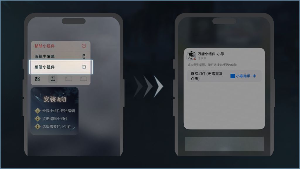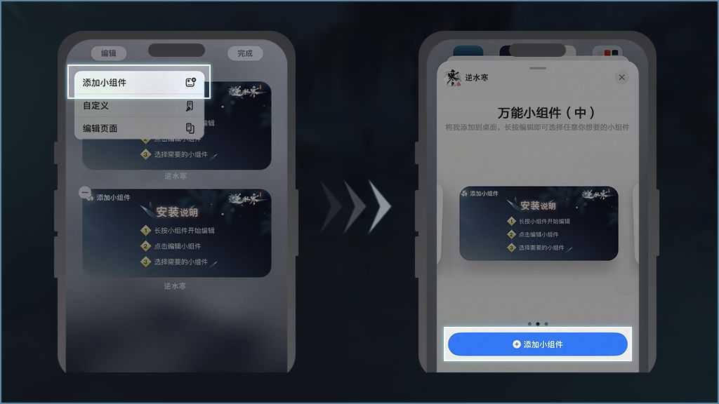 步骤三:长按桌面进入编辑状态,点击编辑-添加小组件,在列表中找到逆水寒,选择对应尺寸的万能小组件添加到桌面。
