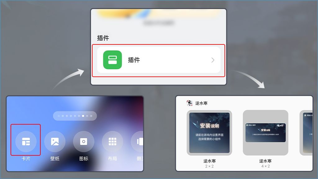 步骤三:长按桌面进入编辑状态,点击卡片,在卡片中心滑动到底部,点击插件,在插件列表中找到逆水寒,选择对应尺寸的万能小组件添加到桌面。