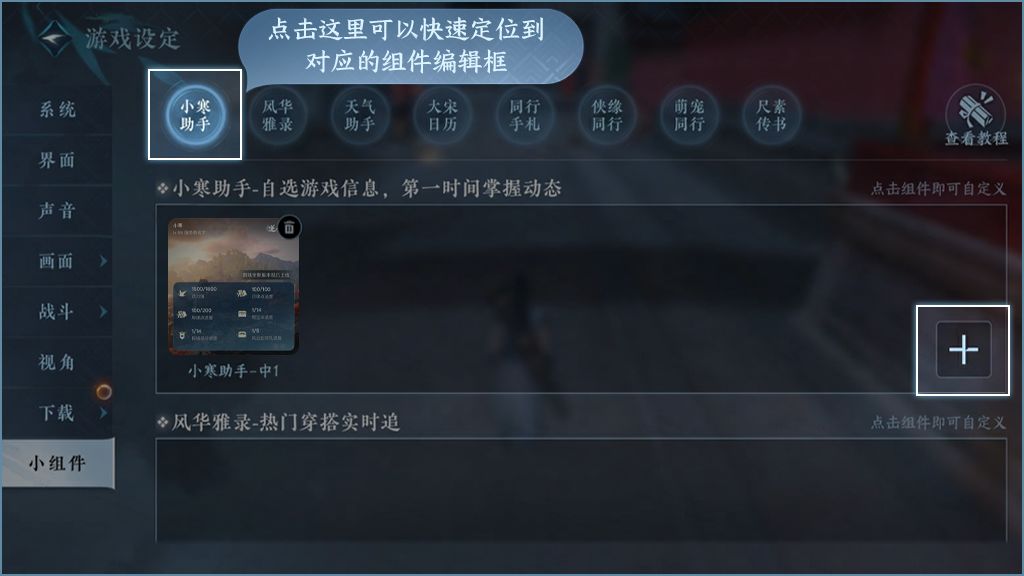 步骤一:【游戏设定】里找到【小组件】页签,点进去在【小组件自定义】中添加想要的组件前往编辑。