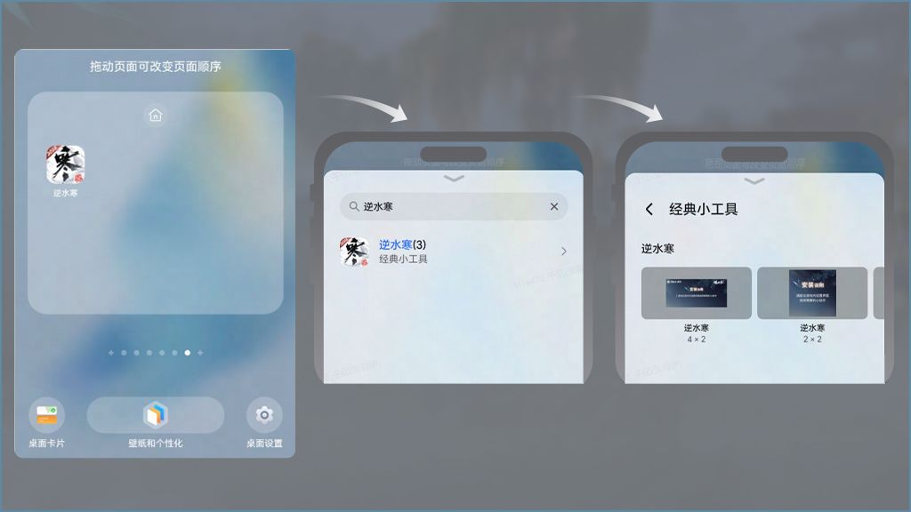 步骤三:长按桌面或双指缩放进入编辑状态,点击桌面卡片,搜索逆水寒,选择对应尺寸的万能小组件添加到桌面。