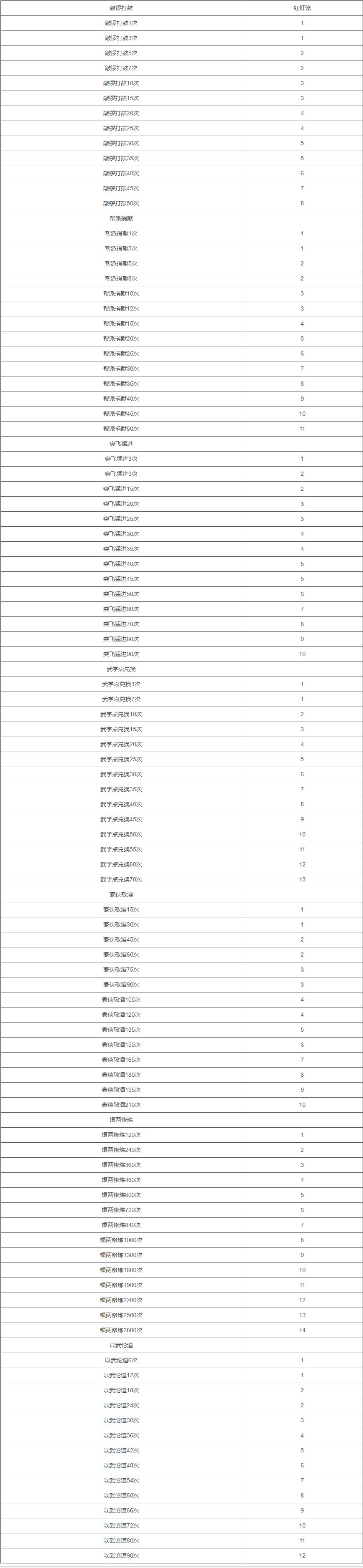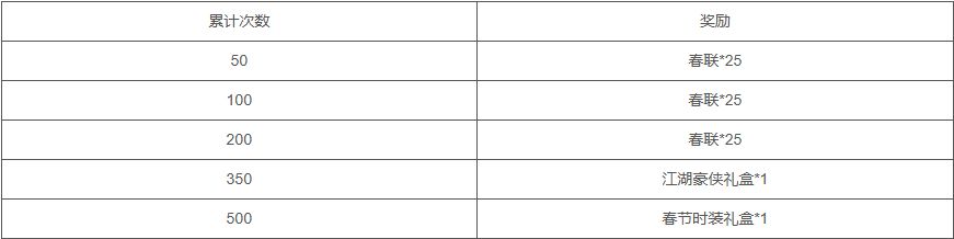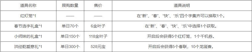 活动期间,通过“江湖磨砺”挂机,在挂机次数内必定掉落“新”、“春”、“快”、“乐”集字道具中其中1个,集齐四个字可兑换道具“红灯笼”,收集“红灯笼”可以兑换各式好礼。