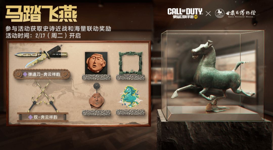 甘肃博物馆联动福利持续送,2月17日,战士们参与联动小游戏,就能获得史诗级近战武器弹簧刀-奔云祥韵、钗-奔云祥韵等联动奖励哟!