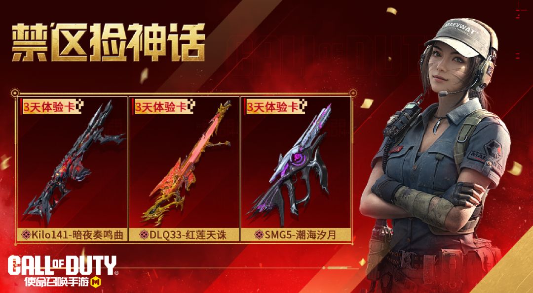 2月10日-3月15日,战士们参与DMZ: 禁区模式,带出指定道具,可领取对应神话级武器体验卡:Kilo141-暗夜奏鸣曲、DLQ33-红莲天诛和SMG5-潮海汐月的3天体验卡哦!