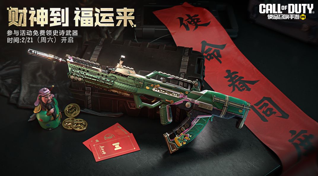 财神到,福运来!2月21日-3月15日,战士们参与【财神好运碰碰碰】活动,就能免费领取史诗级武器Type25-青锋镇福啦!