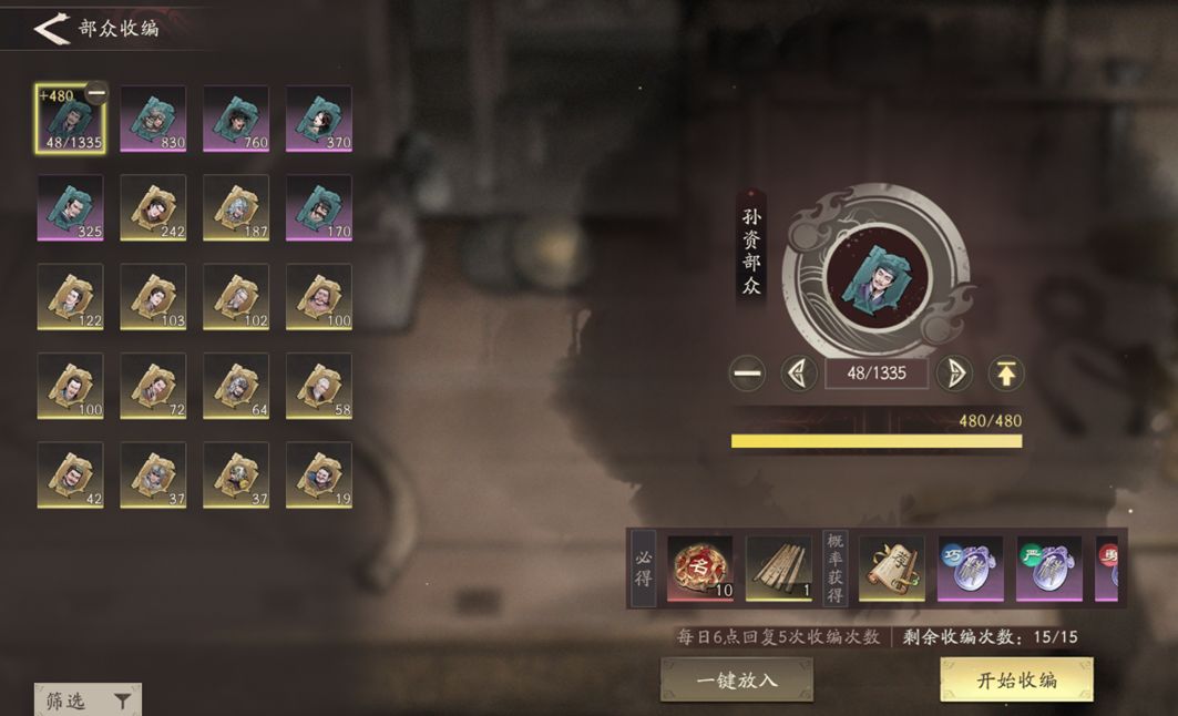 【部众收编】每日更新5次机会,可累积储存上限为15次。每次收编需提供480点收编值,其中每个奇副将部众可提供10点收编值,每个杰副将部众可提供60点收编值。收编必得访贤帖*1与贤名*10,概率获得征召令与识势、达权副将修行材料。