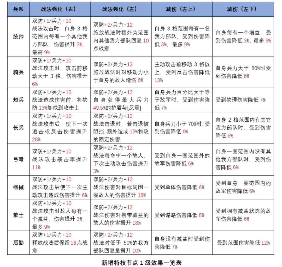 减伤节点部分,除骑兵左上,策士左上及短兵左下外,其余皆为常规增减伤区间。若非强势兵系有左侧终极攻击节点过路必要,短期内最多只点1级以达成最大化性价比即可。