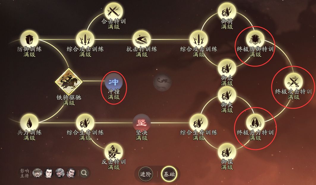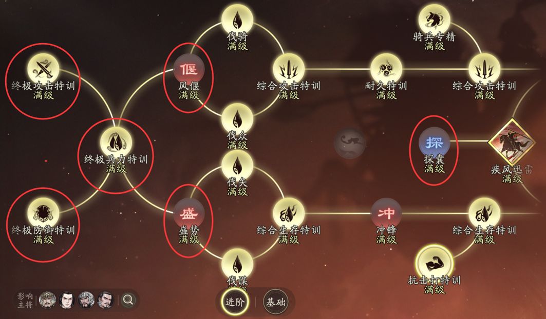 - 兵系专精(10级)、兵系增攻增伤特殊节点(10级)、综合攻击训练(10级)、伐骑(10级)、伐众(10级)、御骑(10级)为高优先级