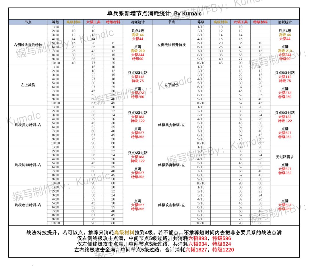 新增的右侧战法强化特技,大部分都只针对单次战法生效,且伤害提升都不是战法增伤区间,仅为常规增伤区间。如果骑兵与长兵这类右侧战法已点满,可以考虑仅消耗高级材料点到4级,5级开始需求特级材料时暂停。