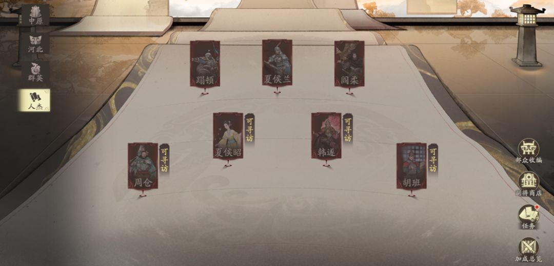 结合每次寻访消耗访贤帖*10,每次寻访获得20%寻访进度可知,每完成10次(2天)【部众收编】可累积1次该页面的副将寻访进度,每10天可寻访到1名该页面副将。算上任务赠送访贤帖数量,大约30天后寻访到塌顿(第二排最高优先级)。