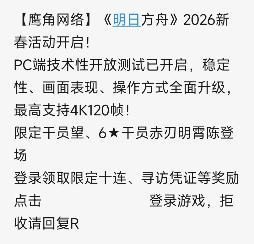 本次短信邀约文案温馨走心,搭配节日祝福,让不少回归与常驻博士倍感惊喜。配合2月10日正式开启的新春版本,全新SideStory「辞岁行」、限定干员、新春福利与PC端技术性开放测试同步上线,内容体量与福利力度均属年度重磅。
