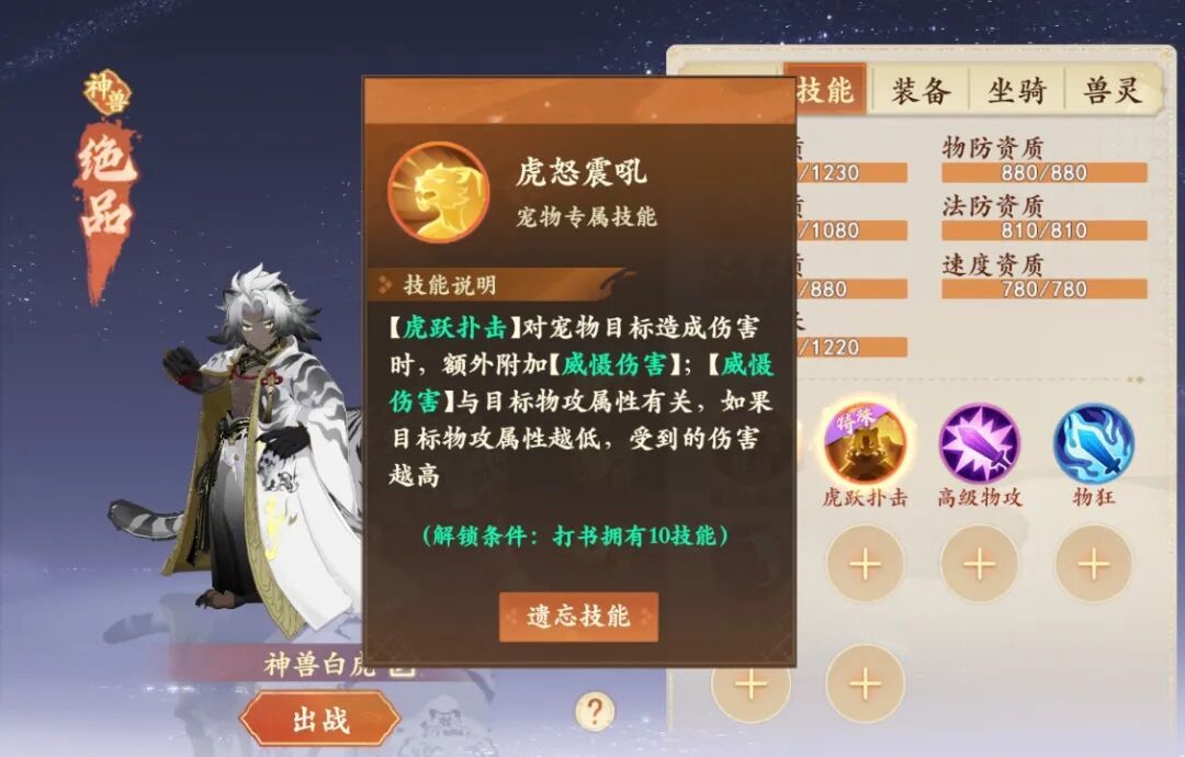 (2)虎怒震吼(被动技能):【虎跃扑击】对宠物目标造成伤害时,额外附加【威慑伤害】;【威慑伤害】与目标物攻属性有关,如果目标物攻属性越低,受到的伤害越高。