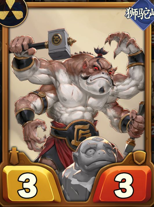 玩法解析:在三本时看到四只手和白面熊彪可以拿下提前养一养商店随从。四本拿下小钻风。对于小钻风来说出手次数越多越好,所以最好想办法给小钻风加上狂怒的特性。对于狮驼岭来说孔雀公主和青狮精来的越早越好。通过打出孔雀公主后援获得的狮驼岭的随从以及购买部分狮驼岭随从增加青狮精的身材,在青狮精养大之后可以使用一个功德圆满移除护法效果。对于小喇叭,酿造女官,大喇叭可以用来养大小钻风,斑斓老虎和大鹏金翅雕。