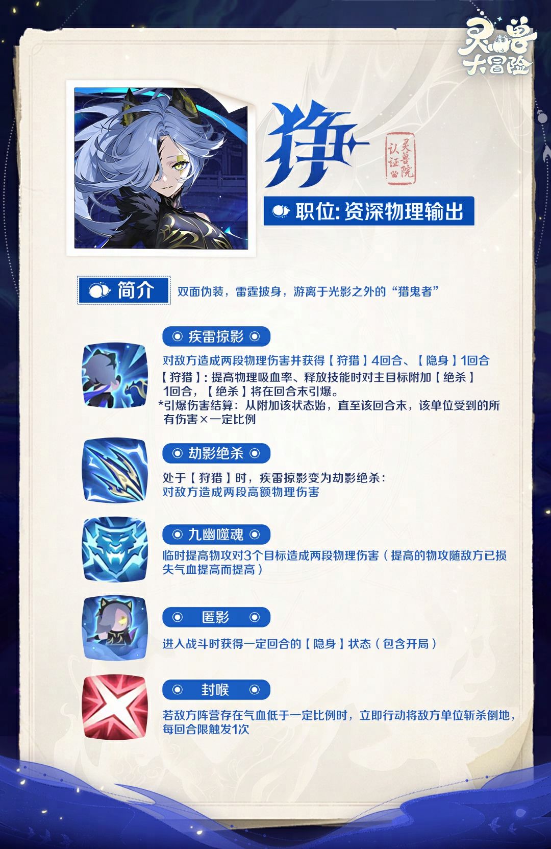 【狩猎】:提高物理吸血率、释放技能时对主目标附加【绝杀】1回合,【绝杀】将在回合末引爆。