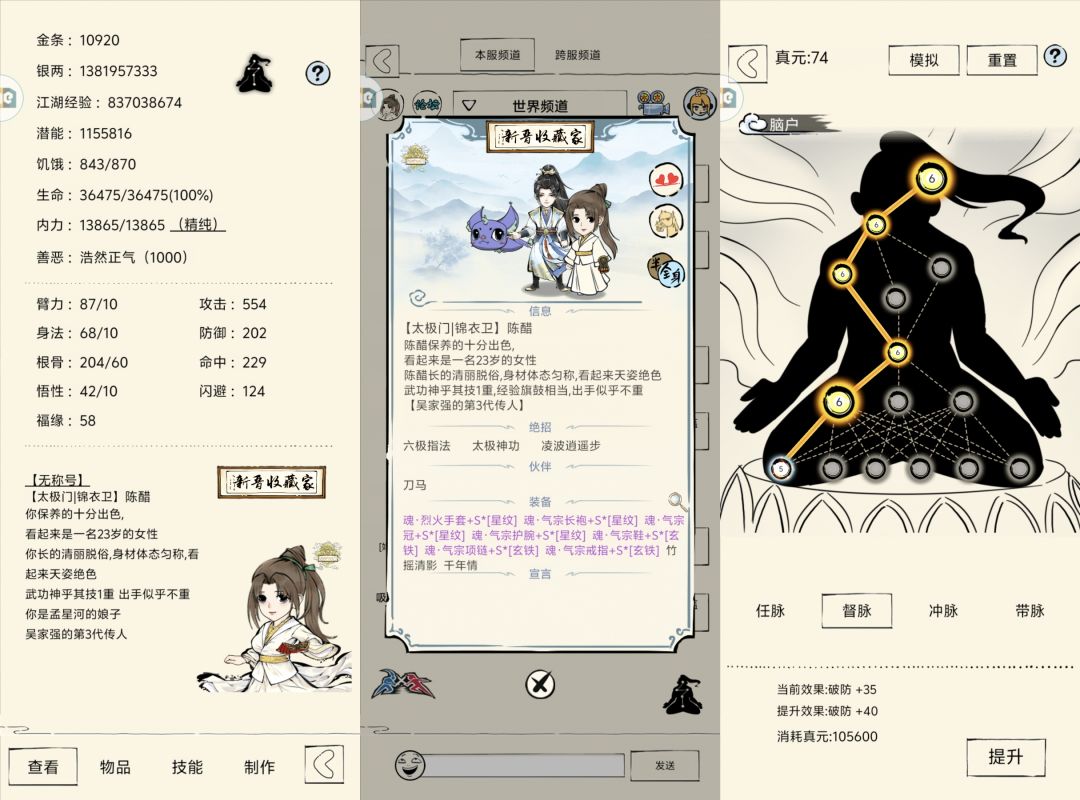 三轮,内力三境,六破,星纹装备,全宝石(宝石约+11根骨,无系数),带350级太极神功,此时对威虎山精英守门员赤荆打出技能:六脉冲穴。