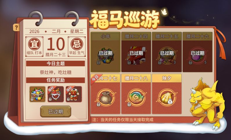 完成后获得【马年提升果实自选箱*1】+【马年春节时装*1(限时30天,不可交易)】,灶神护佑,新岁万事顺遂~