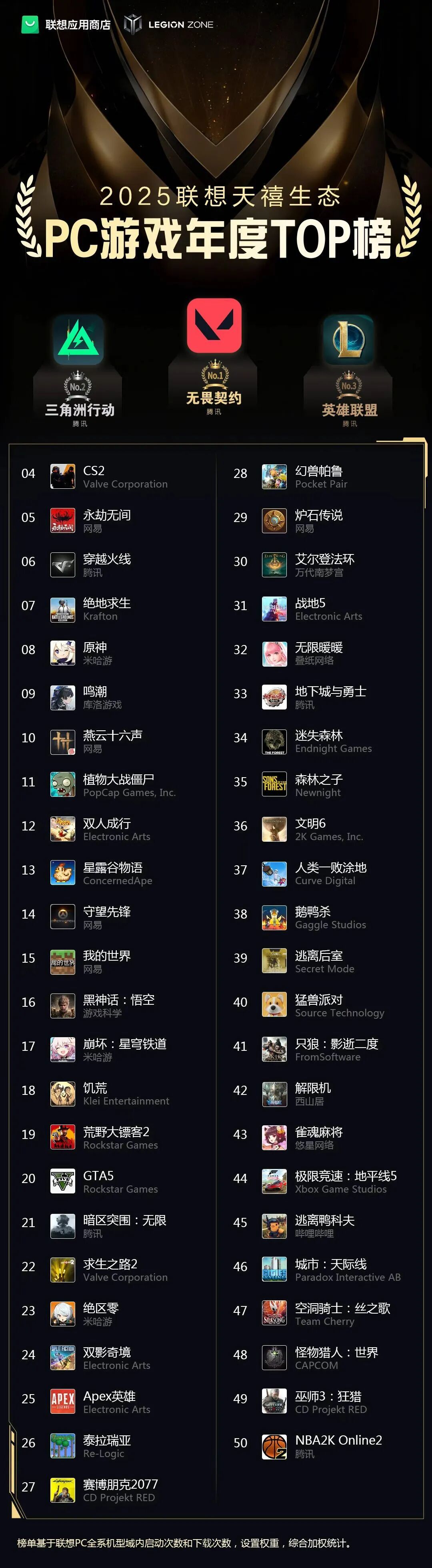 榜单基于联想全系机型的“下载+启动”综合数据生成,直观反映了联想天禧生态月活超2.8亿用户的真实选择:在2026年1月的PC端,到底哪些游戏更火?