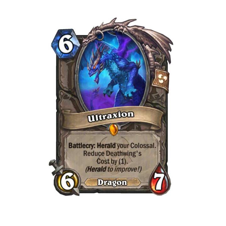 中立兆示传说随从,6费6/7,种族龙,战吼:兆示你的巨型随从。使死亡之翼的法力值消耗减少(1)点。(兆示以升级!)。