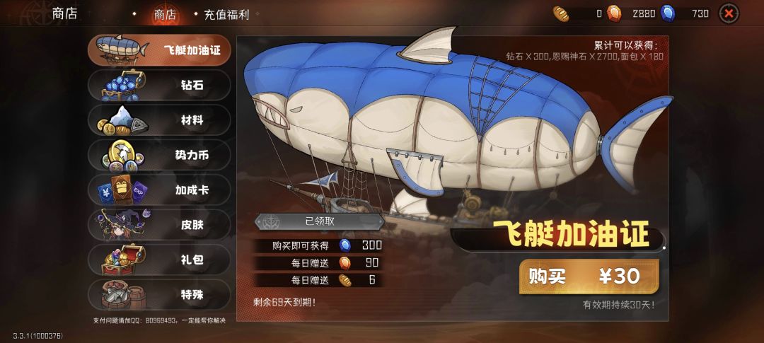 1.月卡(飞艇加油证):30r,300蓝钻+累计2700红钻+180体力(18套金卡)。之前的性价比之王,现在屈居第二。