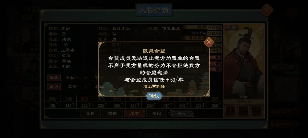首先先说这个平等外交,非同盟情况下平等外交相对有用的是联姻,借道通学,换地这三个。是同盟的情况下,比较有用的是威压。交战情况下比较有用的平等外交是迫和,但是因为需要50信任度,所以在交战的情况下不能使用。所以这个能力我评价是拉完了。 最后一个是阪泉会盟,看得出来这个才是炎帝核心技能,这个技能最重要的是强制会盟成功,昨天试着体验了一下,大国开局有相当好的体验,开局就可以建立会盟,形成一个不打架的主体,你打谁都有一帮小弟帮忙,但是ai操作大家都懂,实际上你打架时候,主力军还是玩家自己。会盟当中有一项,让会盟成员变成自己公卿势力,看着挺厉害,实际操作特别复杂,首先得将会盟改成永久会盟,然后统一历法,统一文化,然后你的会盟成员不得有附庸,不得有宗主国,总之,操作复杂。大国开局有一定作用,小国开局,就算了。个人评价,介于NPC和人上人之间。