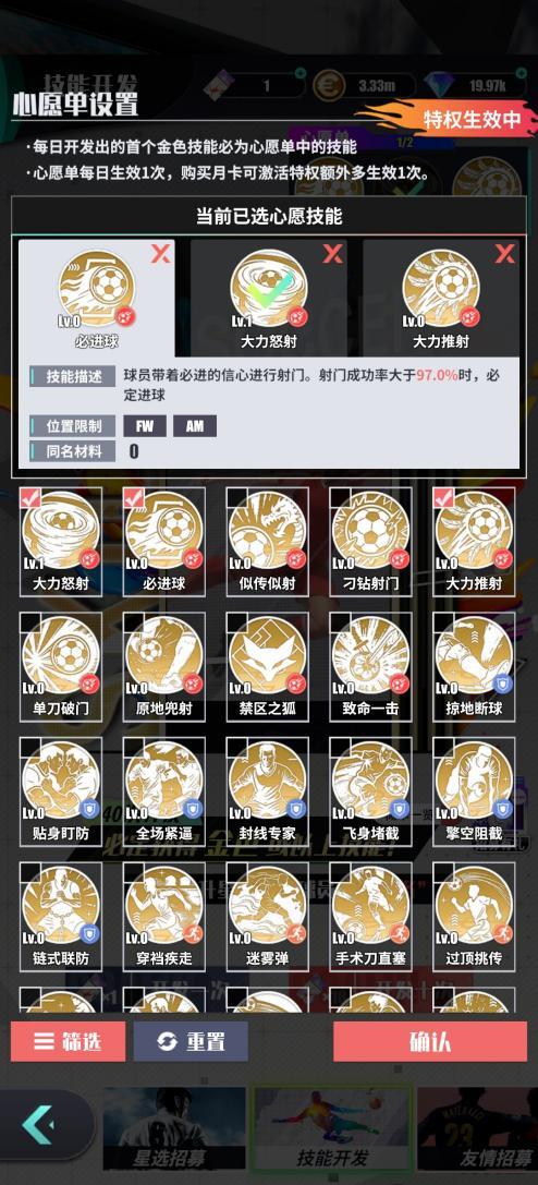 潜能强化:使用保护券提升高等级潜能强化成功率,重点强化边路球员的速度、传中属性和中锋的头球、射门属性。
