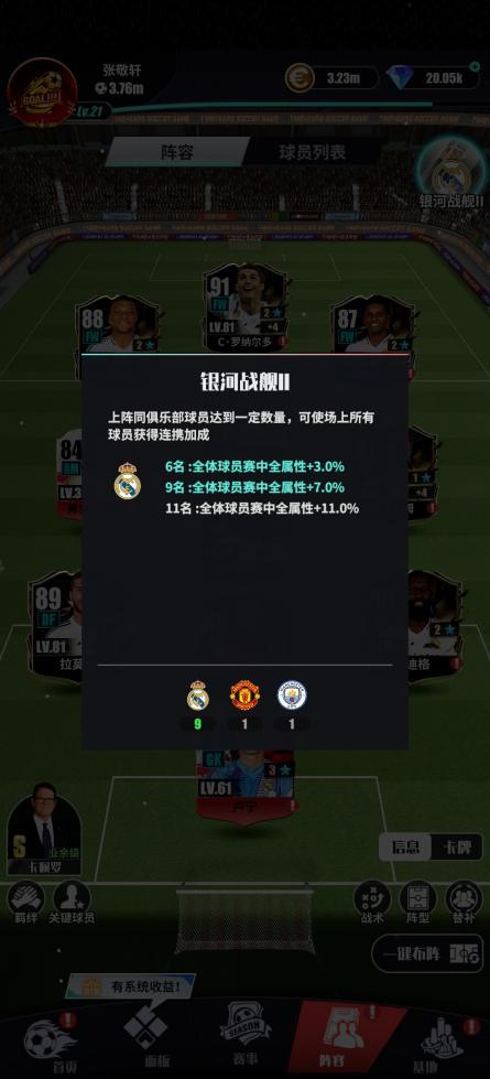 当然,足球是热爱和情怀,不管玩什么阵型,基本上都是凑俱乐部的套对,有加成,如上图。