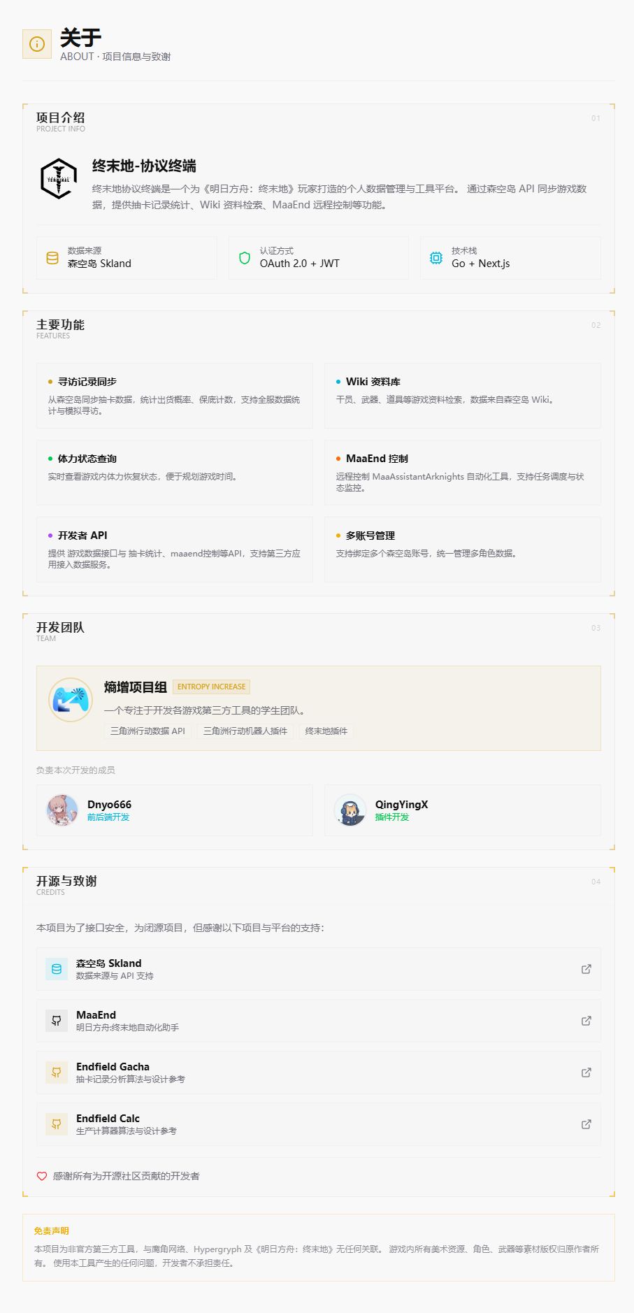 “终末地协议终端”由熵增项目组开发。我们是一群热爱《终末地》的学生团队,致力于为玩家提供最纯粹、最实用的第三方工具。