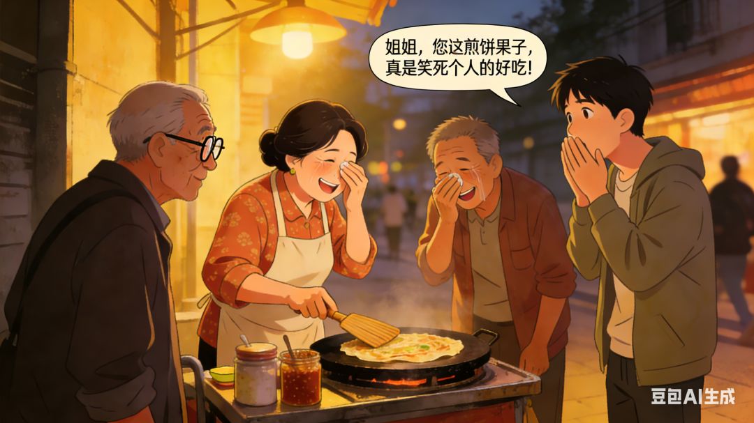 就比如上周,我在常去的煎饼摊,想尝试用网上学来的天津话夸大姐手艺好。一开口:“姐姐,您这煎饼果子,真是笑死个人的好吃!”(本意想说“笑死个人”在方言里有特别好的意思)大姐愣了两秒,然后和旁边排队的爷叔一起笑到抹眼泪。结果呢?她多给我加了个蛋,还教我正宗的说法:“得说‘嘛香不香的,爱就完了!’”
