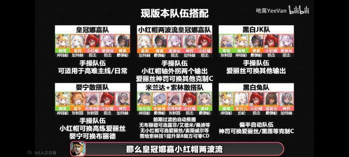 以上是我在B站看的,大多数都一样,所以照抄就行了,至于皇冠一号位是因为,回血是从左往右的,至于图中为啥很少出现小红帽黑莲爱丽丝同窗,自己去搜攻略看,我感觉我说不明白,简单来说一下词条,由于皇冠被动叠满需要打43*20=860,词条方面装弹是必备的,2-3就可以了,其他就是有啥用啥,不强求,不细讲,弄不懂,自己去看攻略