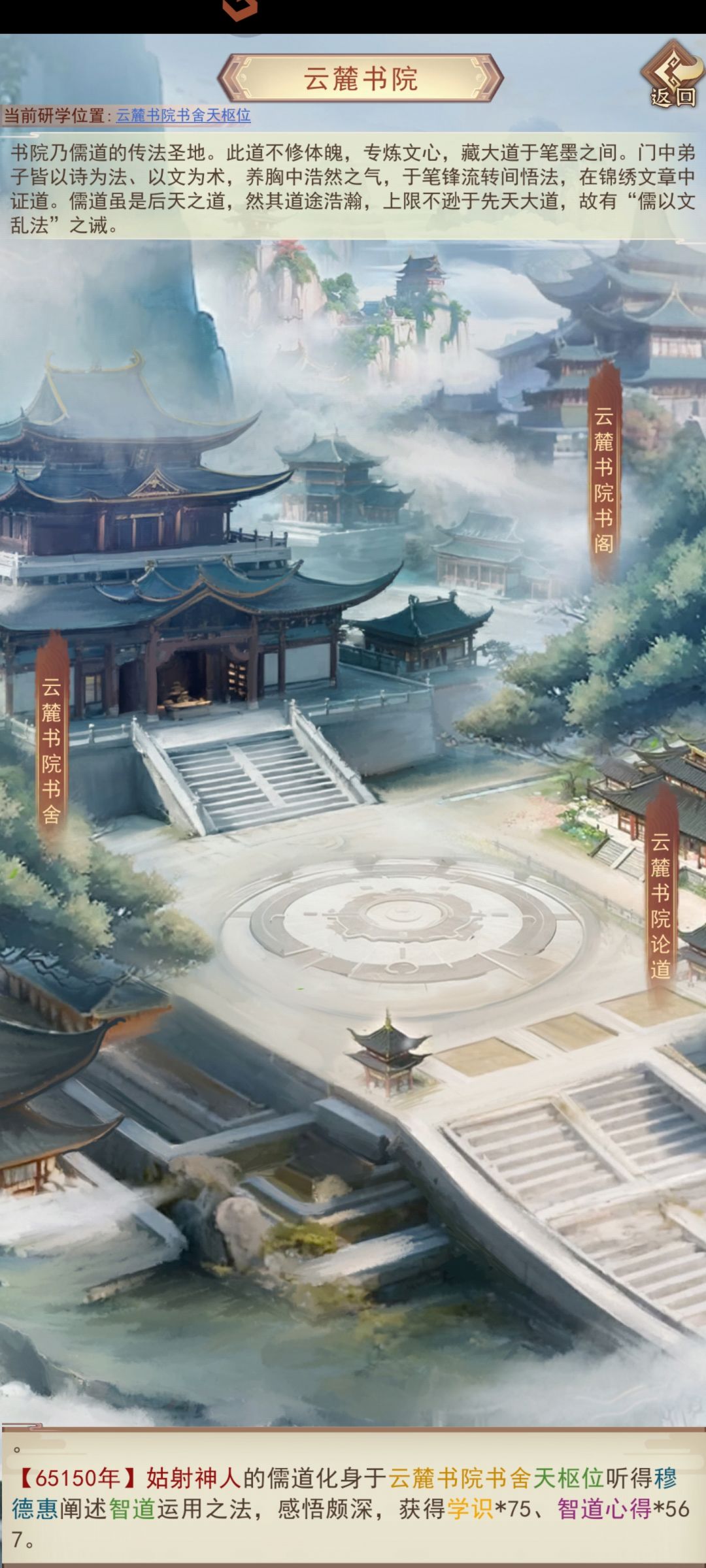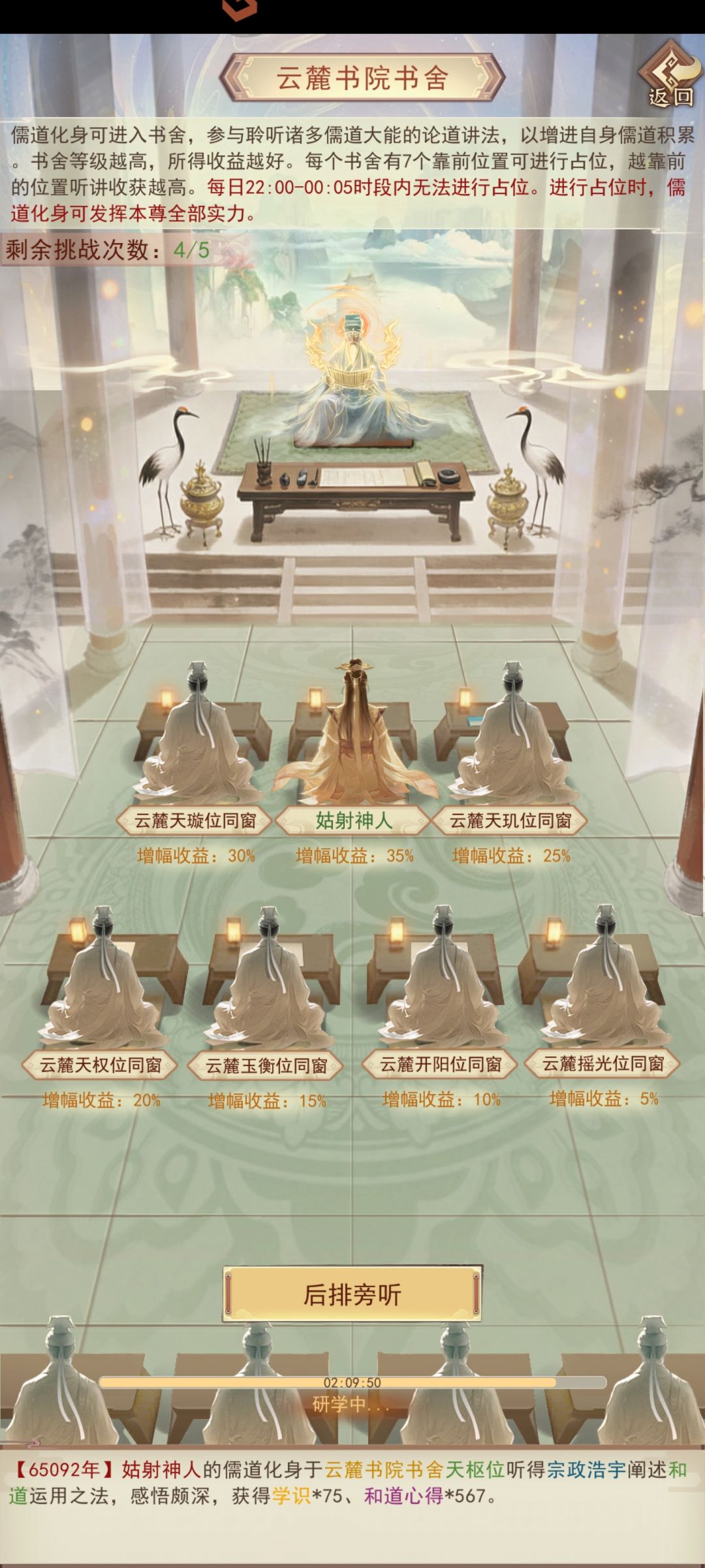 进入任意书院开始解锁书院玩法,首先是书舍,直接就是一手化身上学堂,占的位子越靠前学习效果越好,后排你就睡大觉吧(也有保底),每2.5小时结算一次奖励获得学识和各类儒道心得。其中学识用来兑换书院书阁的书籍。心得升级对应儒道本源。
