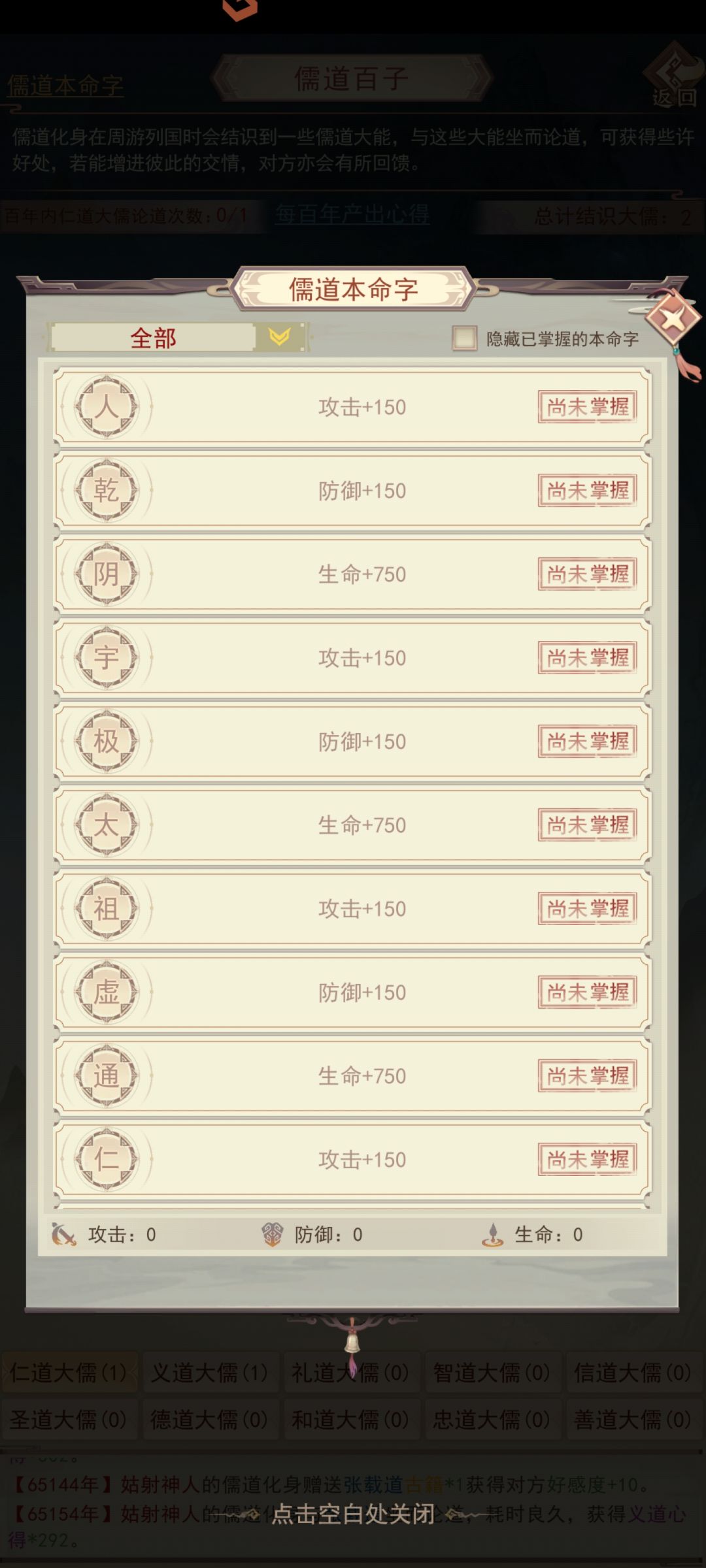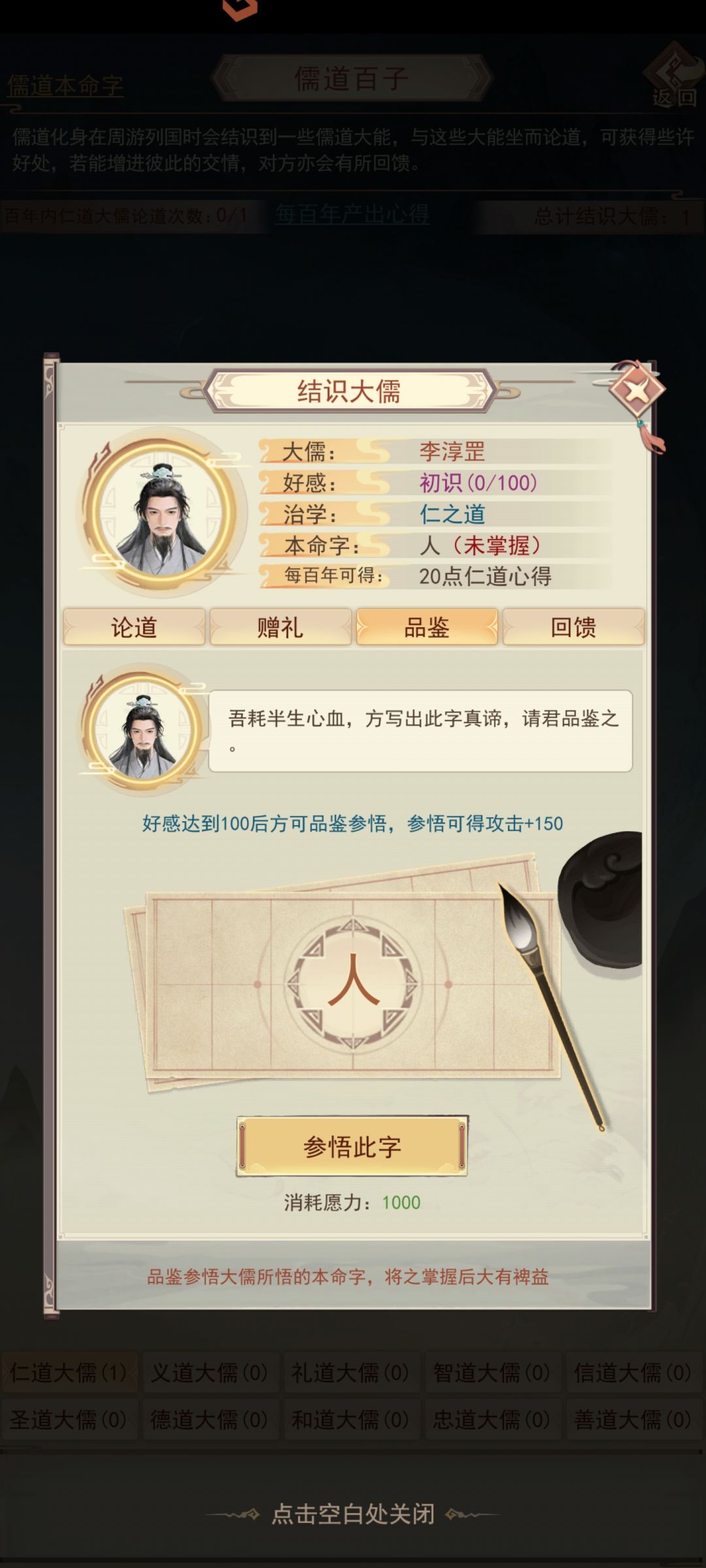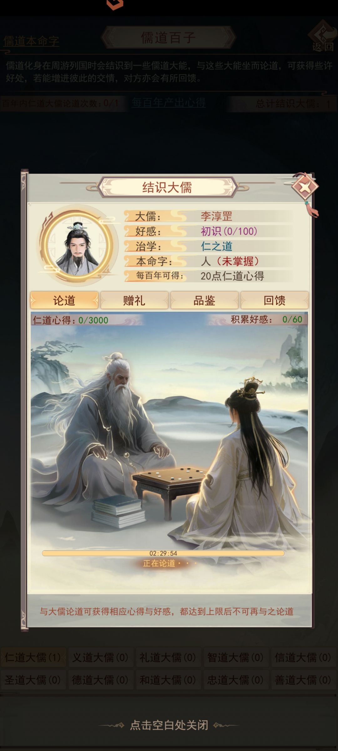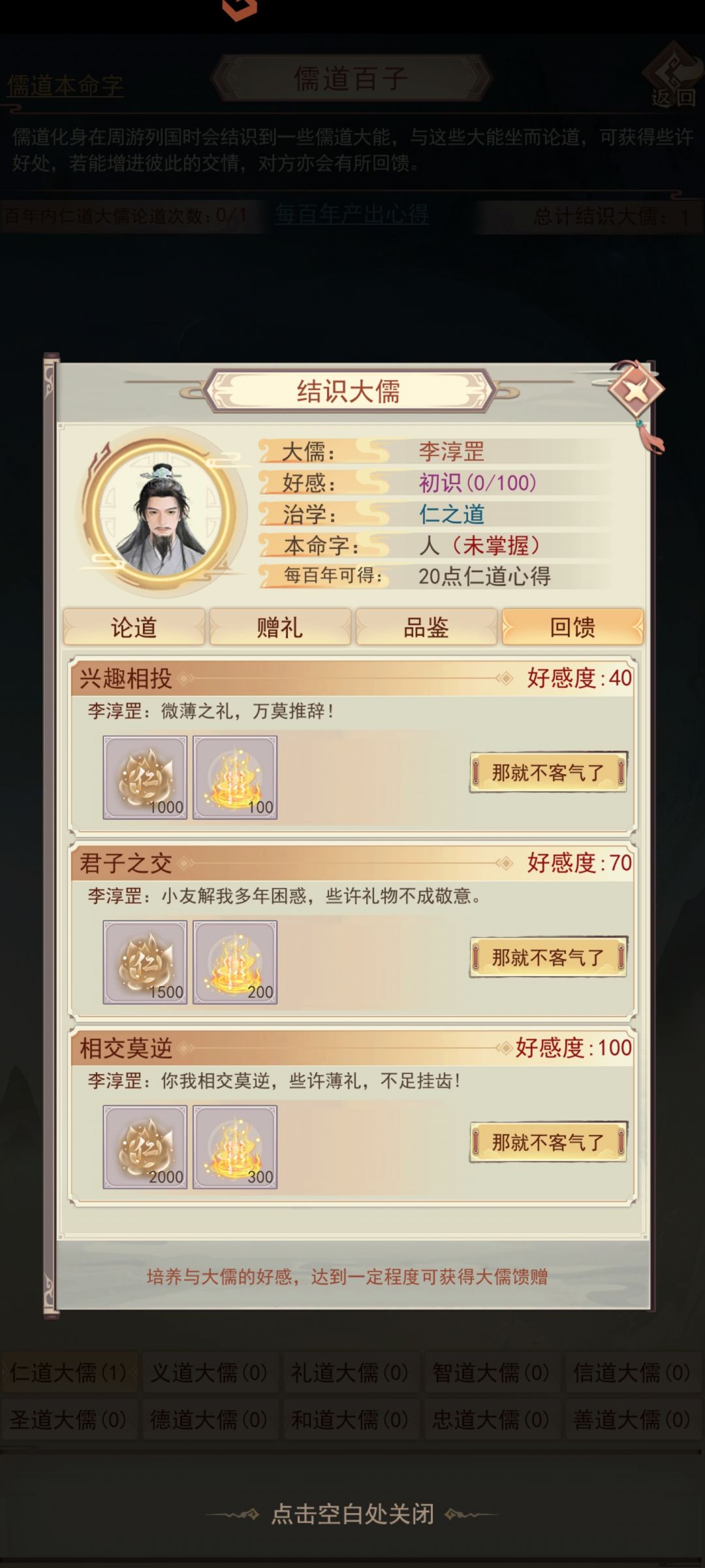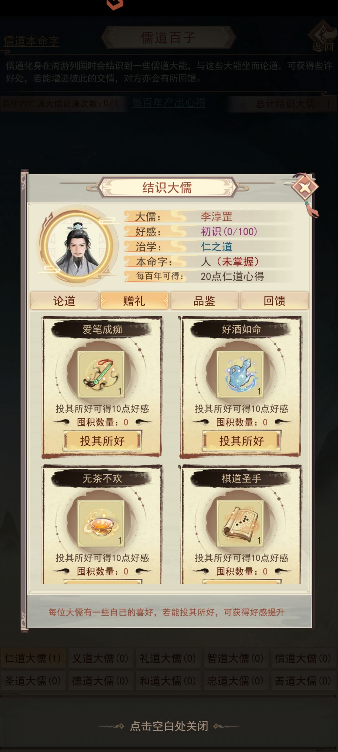 游历图中获得的各类道具(字画酒茶棋谱扇子之类的)可以送给对应的儒道大能提升好感度,大能好感度100以后可以获得大儒本命字。此外好感度达到对应阶段还可以领取大儒回馈的奖励(包含大儒对应的气运心得,和儒道法则)