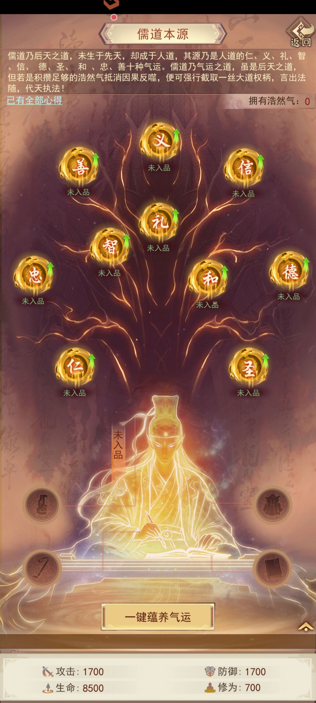 通过消耗各类气运心得可以提升对应的儒道本源分支,儒道本源分为十种气运。儒道本源是儒道提升属性的主要方式。 蕴养儒道气运可提升化身的儒道境界,提升儒道境界后可以升级儒道法宝品级,解锁立言殿,明志壁等后续玩法。