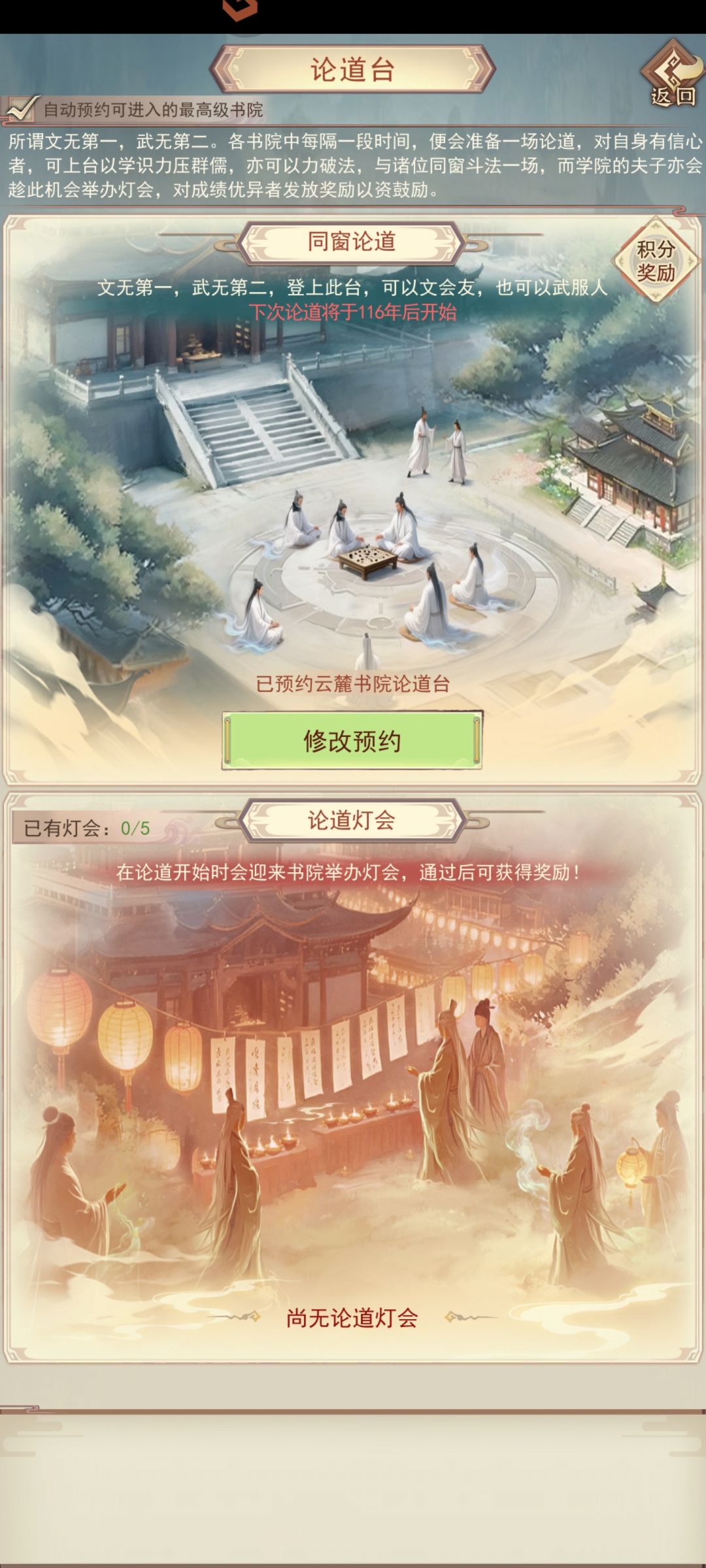 论道台玩法,每座书院皆有一座论道台,书院的儒修们每隔一段时间(每周日开启)都会举办一次论道大会,可以提前预约,越往后的书院论道台效果越好。