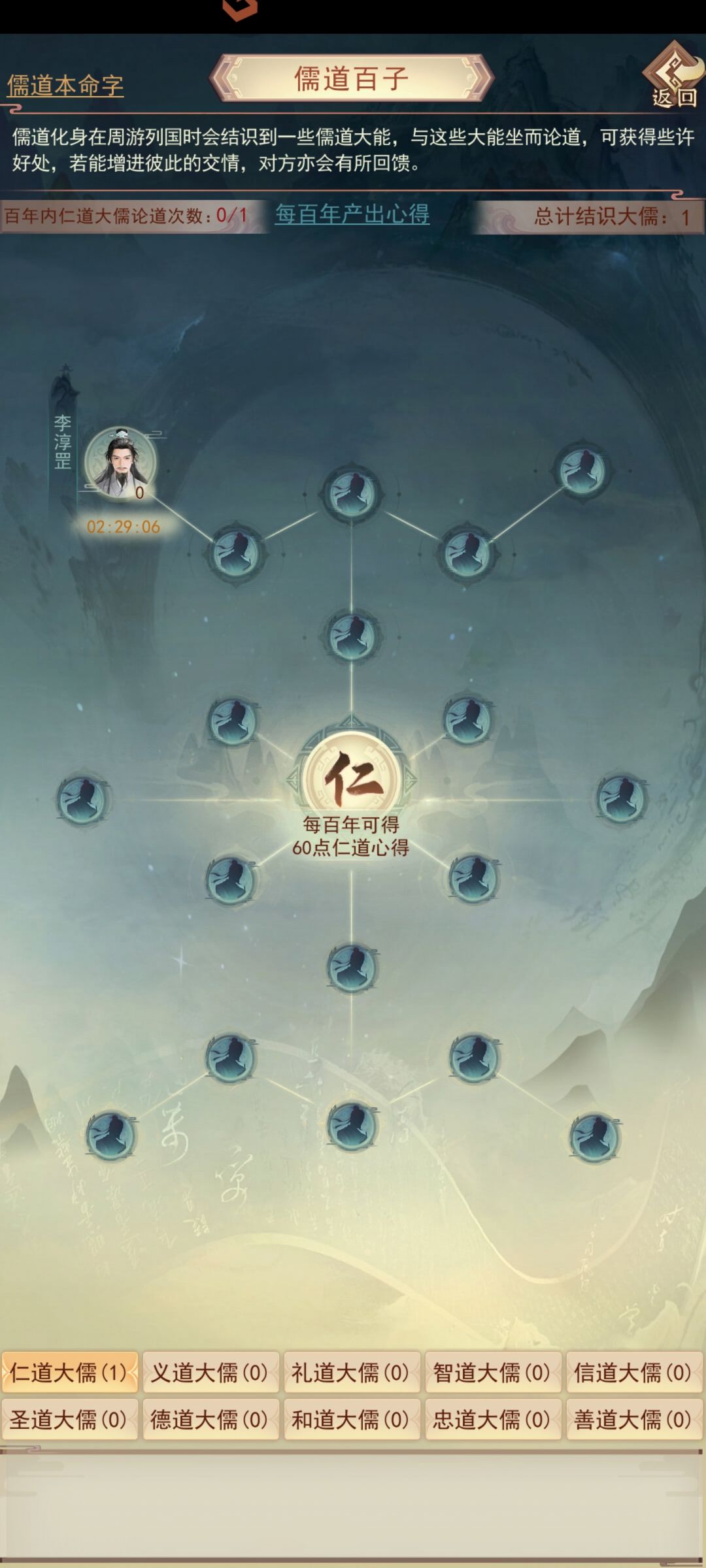 儒圣道卷为儒道的主干玩法,各位道友通过每日固定次数的游历探索,获取儒道各系分支心得奖励,通过周游列国从而进入各大书院,游历路途中亦可结识各位大儒,开启相对应的支线玩法。
