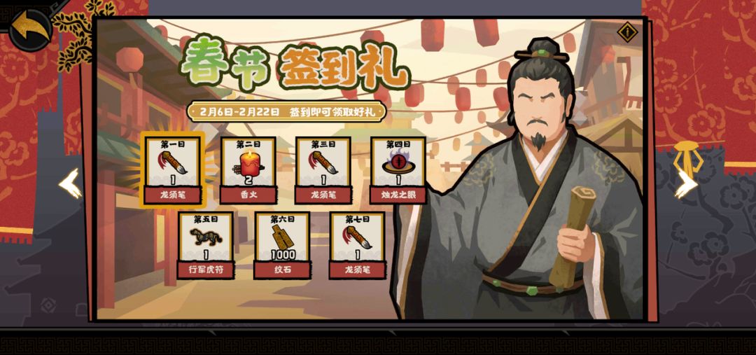 2月6日至2月22日,登录即可领取每日好礼!龙须笔、虎符等丰富道具等你来领。