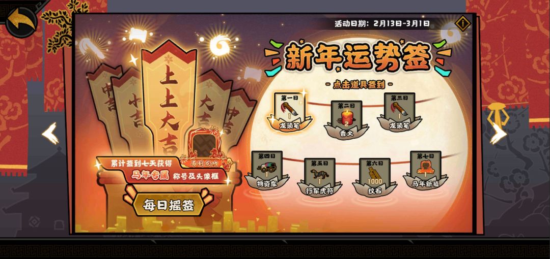 每日求签,好运加满!2月13日至3月1日,新年运势签可获取丰富奖励,累计签到7天,即可获得马年专属称号和 头像框!