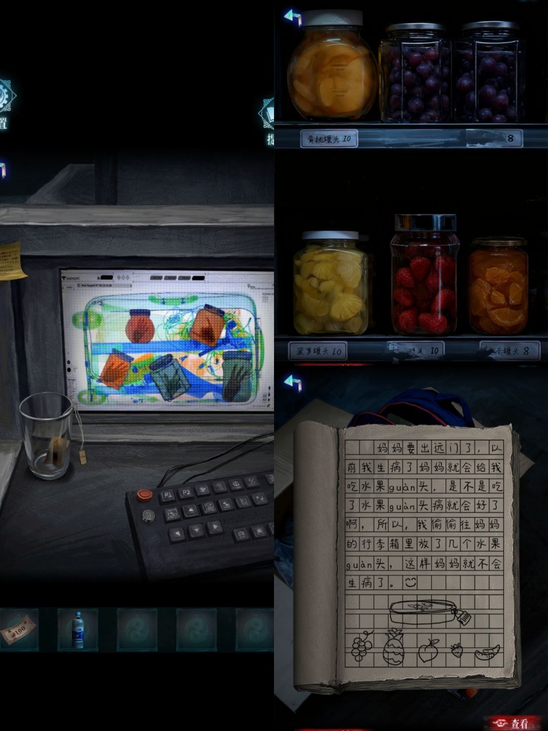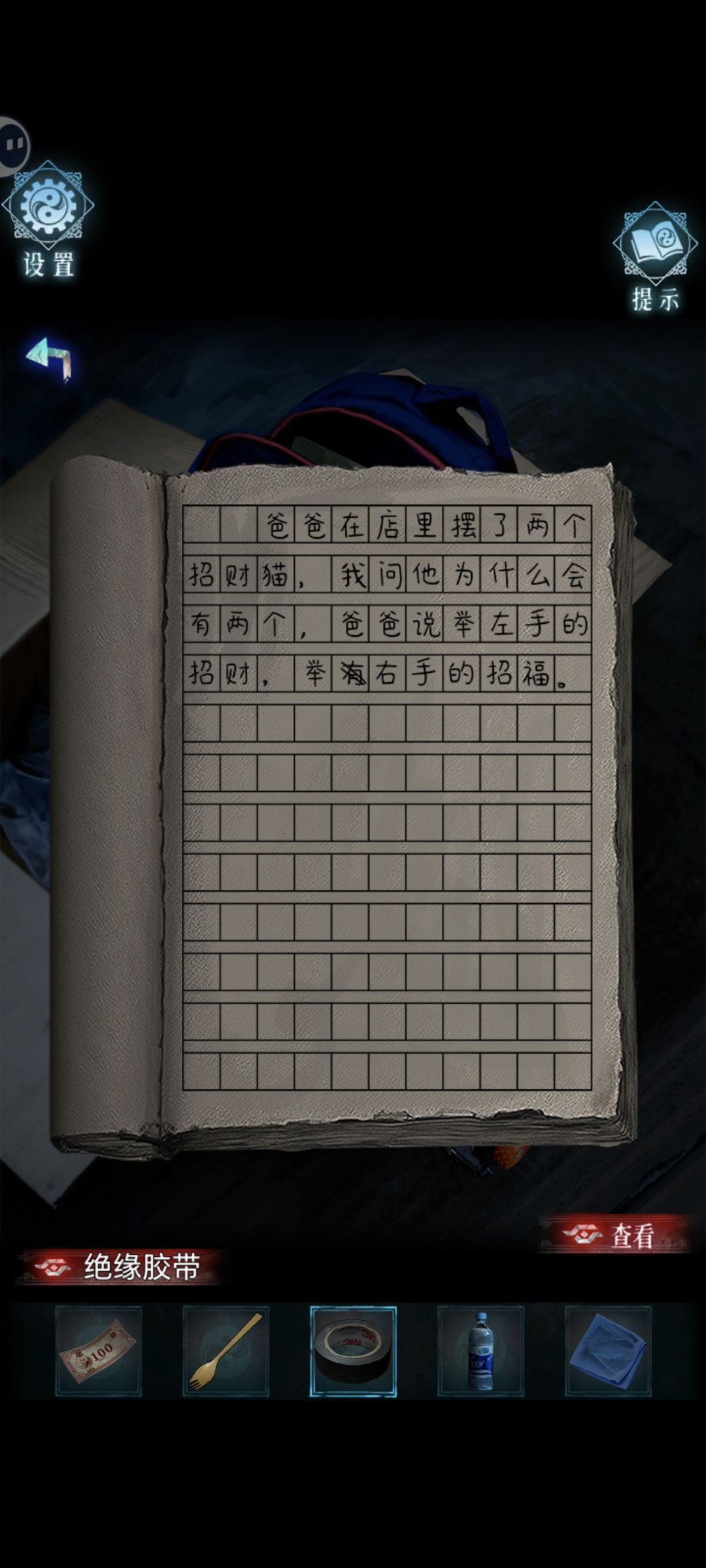 1.进入便利店(我分为内外部),在内部,点击蓝色的书包的小夹层,出现赛车,点击获得【电池】,这个是放给招财猫的,点书包内部,有一个日记本,下图中,可知道关于招财猫的线索,两张图片结合,点击招财猫,密码为(福财财福财财福福),获得【透明卡片3】。