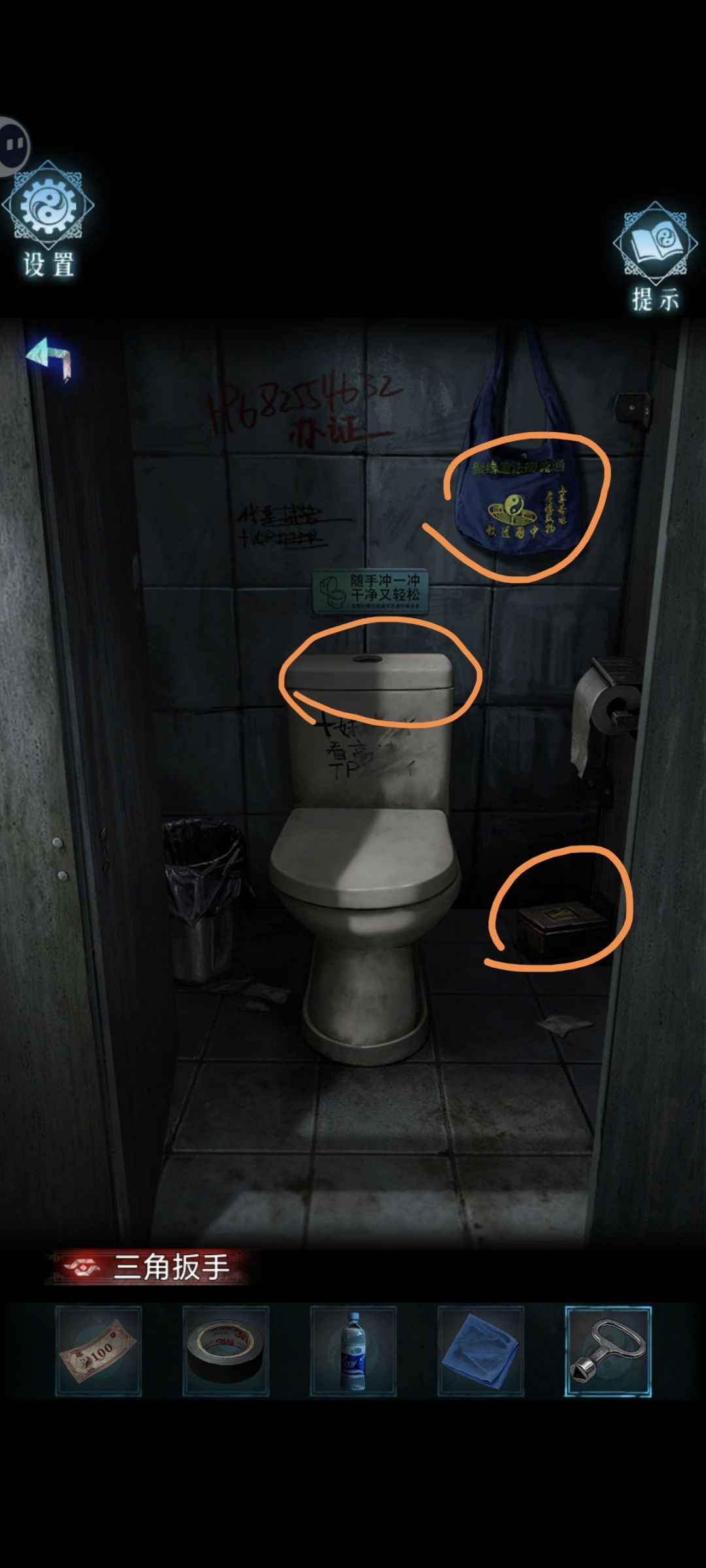 2。去男厕所(我还是分为内外部),外部扒垃圾桶获得【叉勺】加【卡片】,用【叉勺】扒拉洗手台上的一盆靠右植物,从土里获得【三角扳手】。进入内部,用它打开最右边的厕所,获得【符水】,在水箱的地方获得【牛皮纸】和【水龙头旋钮】。返回厕所外部,牛皮纸用烘干机吹干,旋钮按回缺的水龙头上。